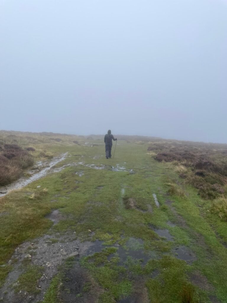 Die Luftfeuchtigkeit ist auf jeden Fall hoch, es ist neblig. Ob es einen Panoramablick hätte geben können, können wir nicht sagen, da die Sicht anfangs unter 200 Metern war. Hatte irgendwie auch was, mystisch irisch eben. Eine Landschaft wie aus Herr der Ringe. Dazu wirklich absolute Ruhe. Auf der gesamten Strecke begegnen uns zwei Wanderer. Ansonsten ist keine Menschenseele zu sehen.