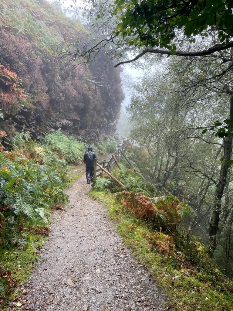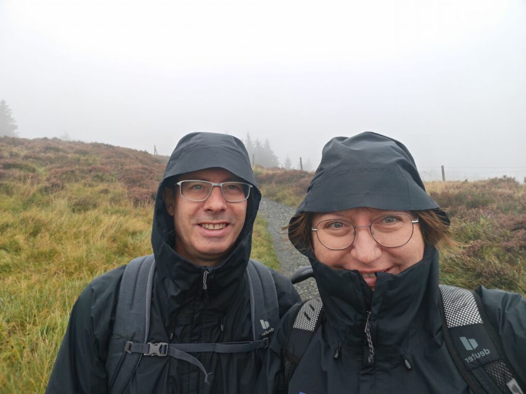 Wir können den Weg heute nur erahnen. Was wir sehen, sieht schön aus, aber leider sehen wir nicht alles. Die Sicht ist denkbar schlecht und es ist richtig nass. Obwohl wir bei der Anschaffung der Regenklamotten ordentlich investiert haben, ist schnell alles (wirklich alles!) nass, auch weil der Wind kräftig pustet.