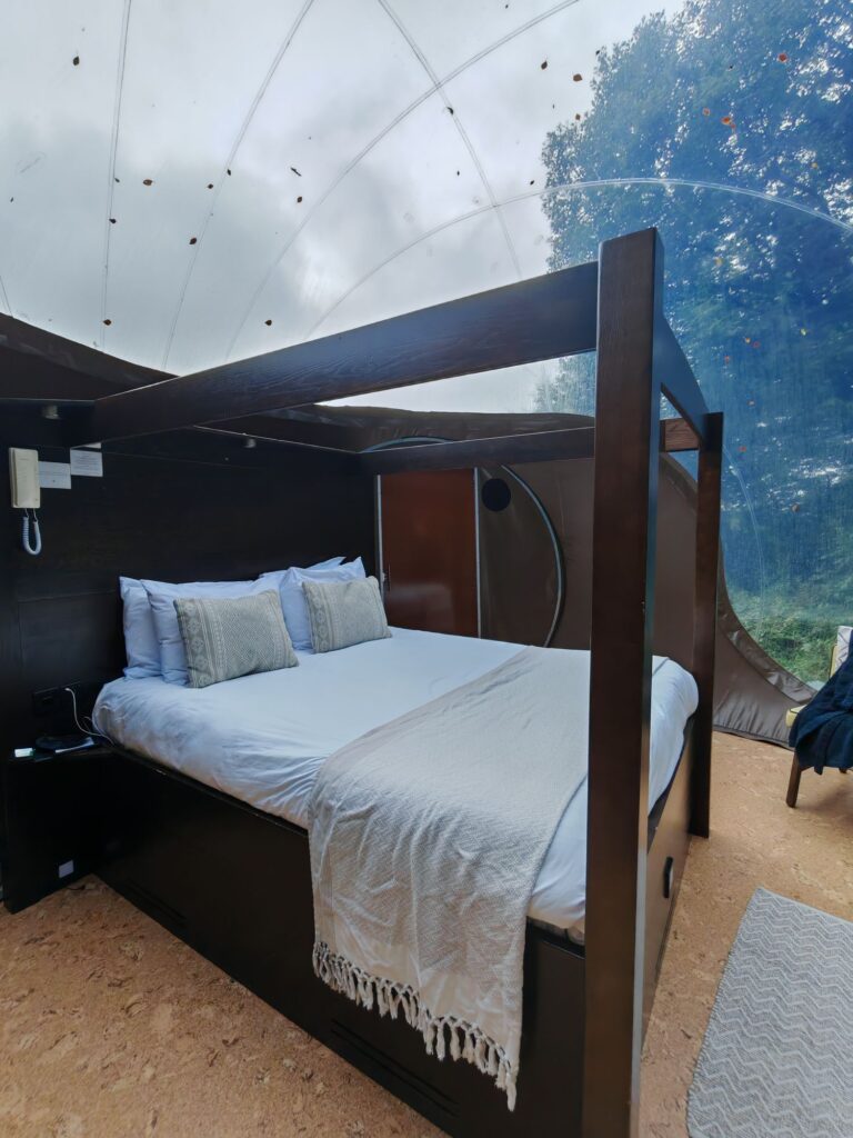 Eine außergewöhnliche Übernachtung muss für uns in jedem Urlaub sein. Dieses Mal müssen wir, obwohl in Europa, den Reisepass zücken und ein Visum (ETA) beantragen. Es geht nach Nordirland, ins Vereinigte Königreich. Wir beziehen kein Zimmer, sondern eine Bubble im Wald. Das Bett ist wie ein Himmelbett gestaltet, aber ohne „Himmel“, schließlich genießt man aus dem Bett den Blick zum echten Himmel.