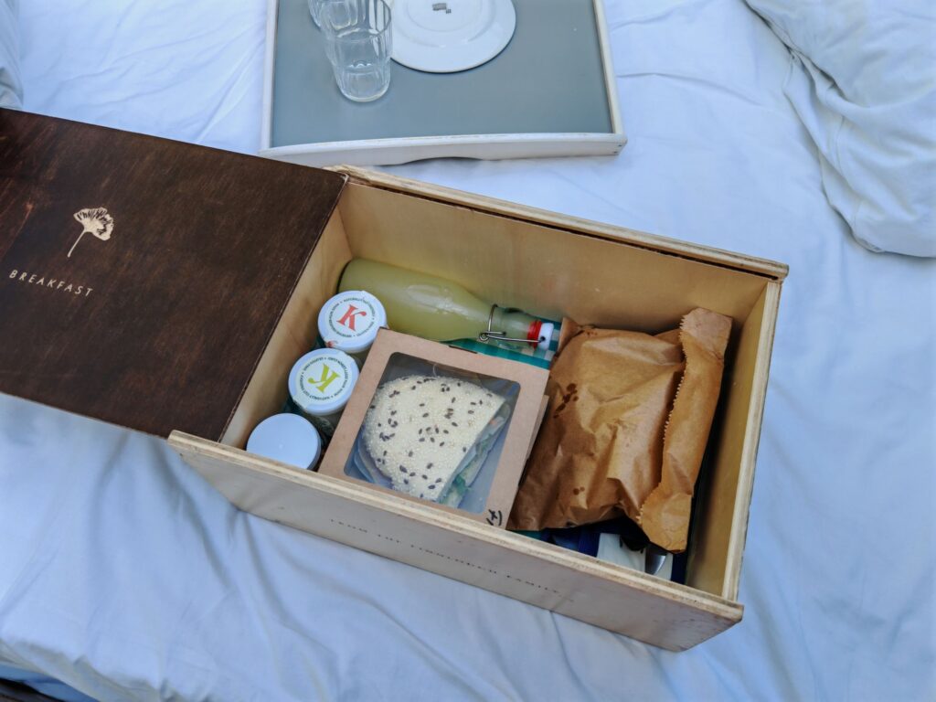 Zum Frühstück bekommen wir eine Frühstückskiste mit reichhaltigem Inhalt vor die Türe gestellt.