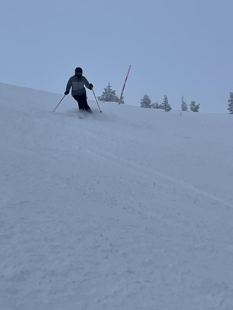 Niederschlag erleben wir dann doch noch. Es schneit. Der Pulverschnee ist perfekt, aber leider ist die Sicht auf dem Berg bescheiden.