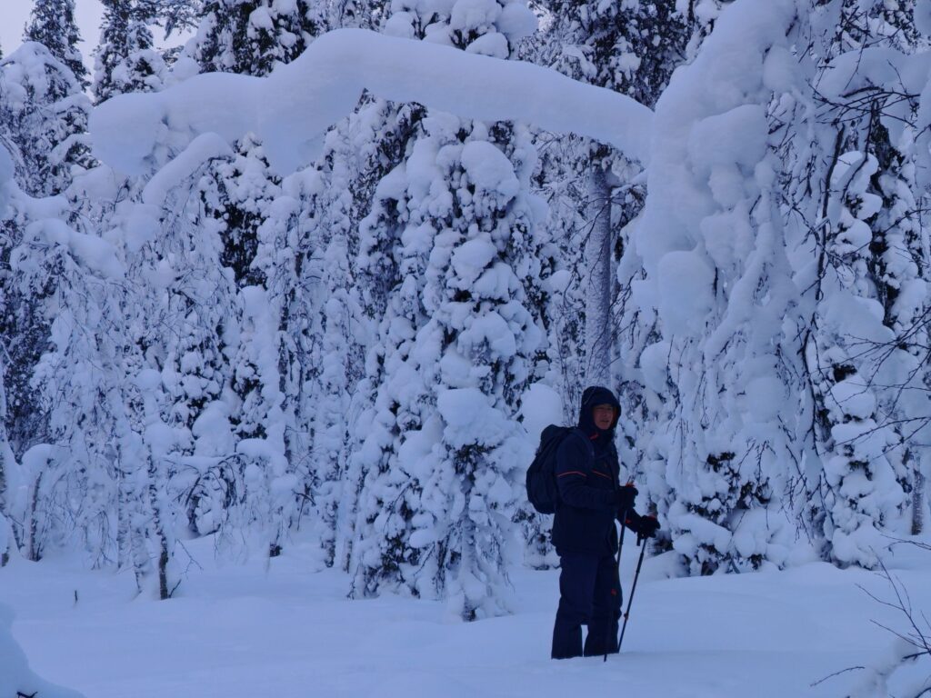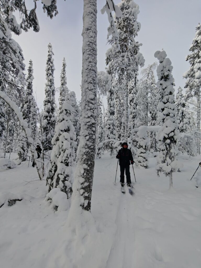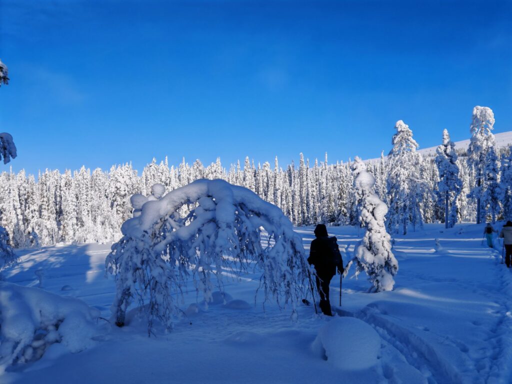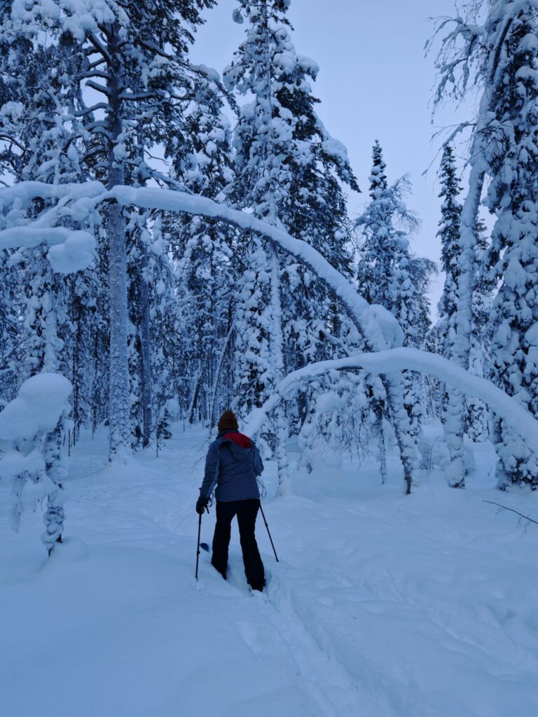 Mit einem Guide fahren wir in den Pallas-Yllästunturi National Park. Wir wandern abseits irgendwelcher Loipen und Wanderwege. Stattdessen ziehen wir in den Wäldern oder auf verschneiten Mooren unsere eigene Spur. Ein tolles Erlebnis.