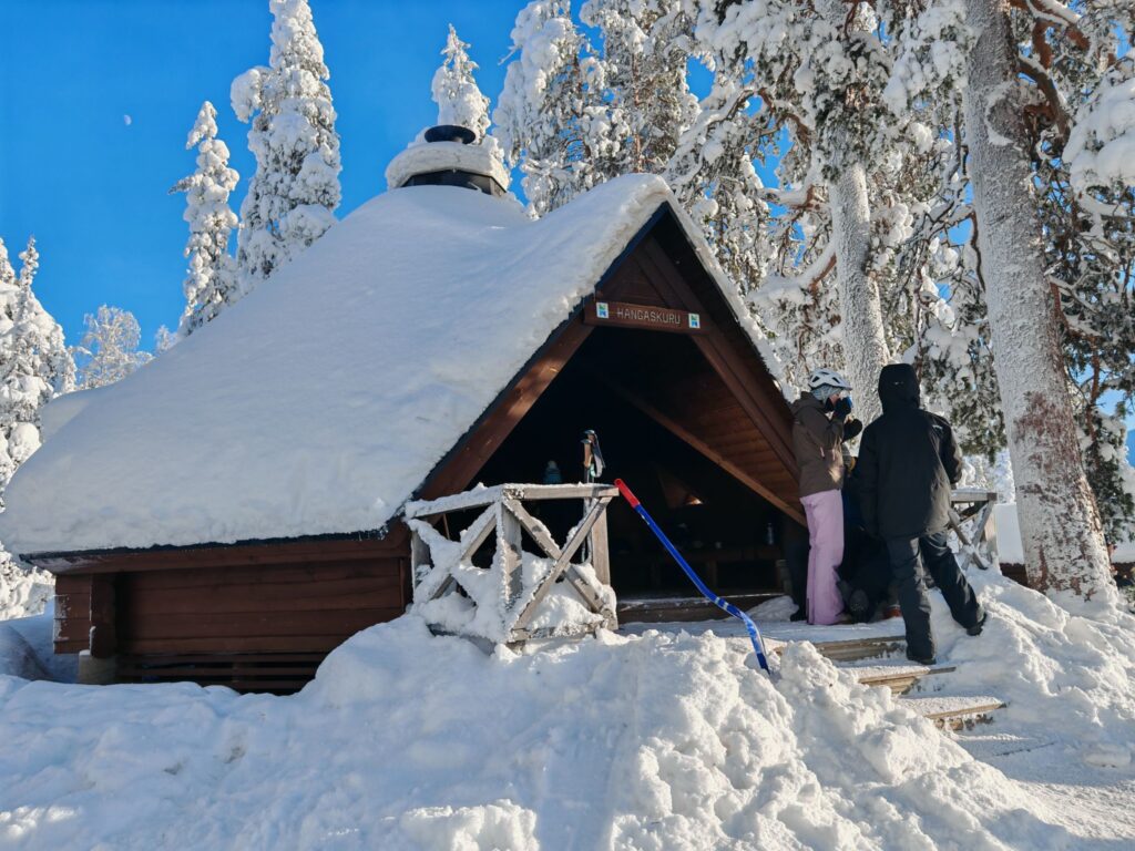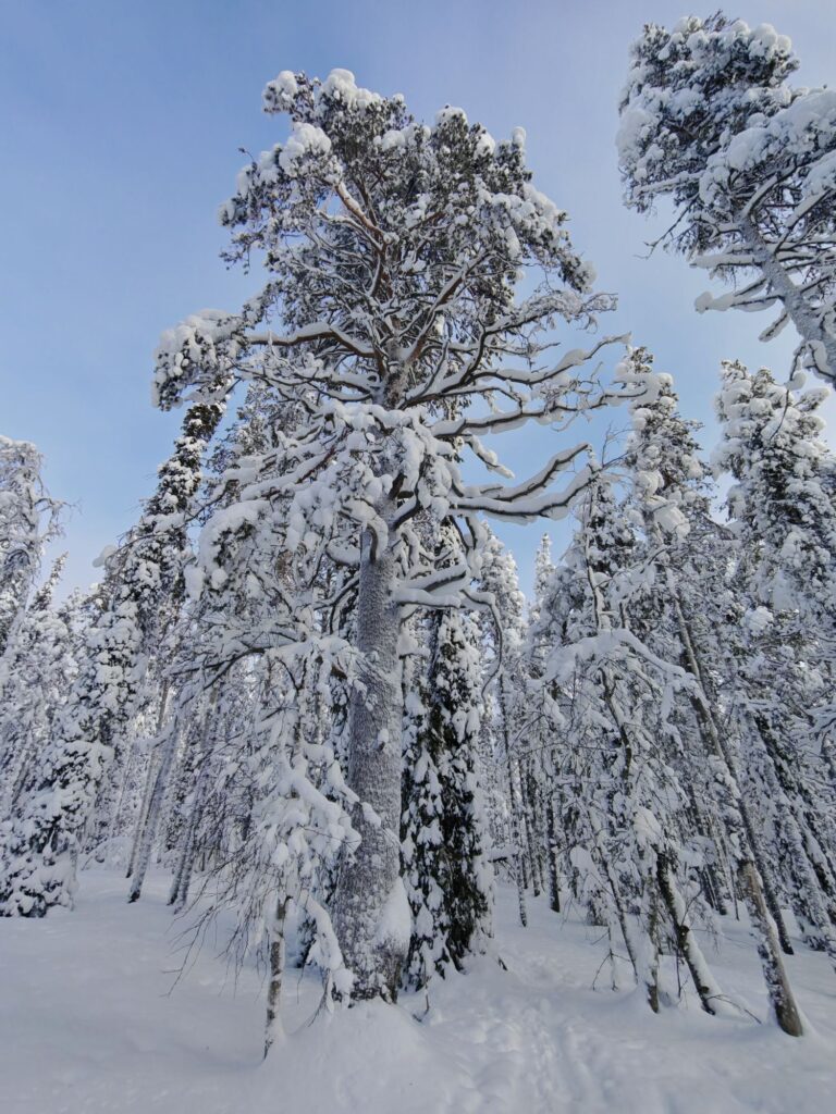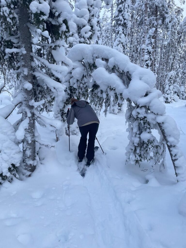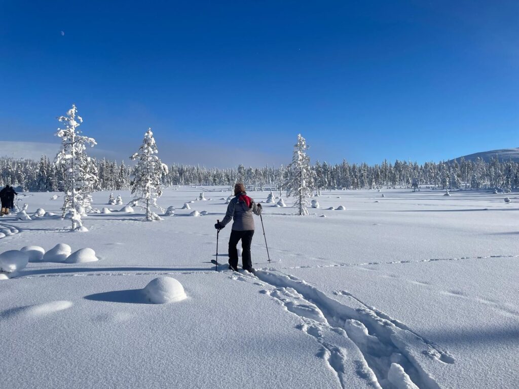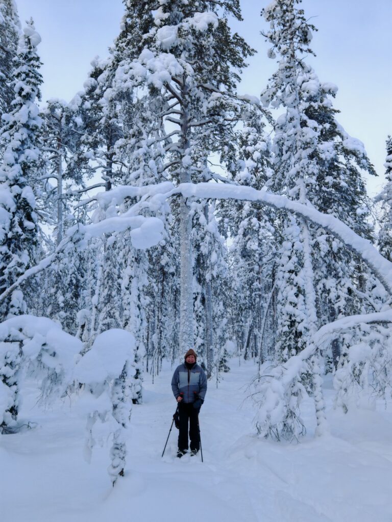 Mit einem Guide fahren wir in den Pallas-Yllästunturi National Park. Wir wandern abseits irgendwelcher Loipen und Wanderwege. Stattdessen ziehen wir in den Wäldern oder auf verschneiten Mooren unsere eigene Spur. Ein tolles Erlebnis.