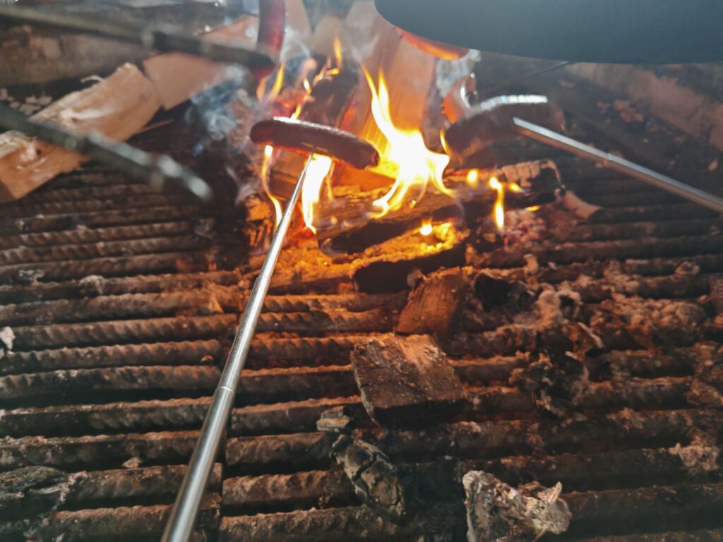 Mittagspause machen wir in einer Hütte. Wir grillen am offenen Feuer Würstchen und rösten Brot. Dann geht es auf einem anderen Weg zurück, damit wir wieder erste Spuren ziehen können.